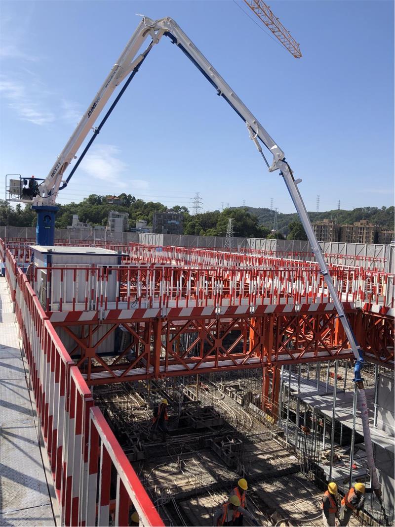 模架式液壓混凝土布料機(jī)自帶鋼平臺(tái)底座,與爬模架體連接傳遞施工載荷,無需自帶動(dòng)力系統(tǒng),爬模爬升時(shí)帶動(dòng)其爬升。其中HGY21模架式液壓混凝土布料機(jī)于2021年11月成功應(yīng)用在使用“住宅造樓機(jī)”的裝配式建筑領(lǐng)域(中建三局承建的廣州大源村項(xiàng)目)。